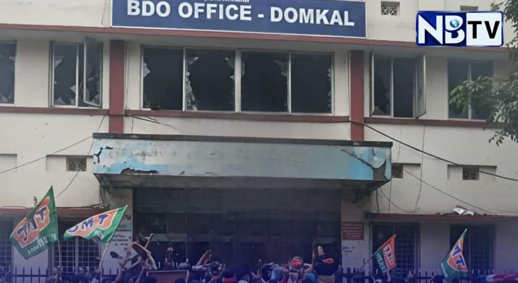 ডোমকল ব্লক অফিসে বুধবার দুপুরে চরম বিশৃঙ্খলা তৈরি হয়। ভয়ংকর গন্ডগোল হয়েছে খোদ সভাপতি পূর্ত কর্মাধ্যক্ষ এবং অফিসের বাইরের লোক বলতে তৃণমূলের টাউন যুব সভাপতি বিডিওর ঘরে ঢুকে বাত বিতন্ডায় ও নানান কুরুচি ভাষায় মন্তব্য করে। পরিস্থিতি আয়ত্তে আনতে বিশাল পুলিশ বাহিনী মোতায়েন করা হয়েছিল। বাংলা আবাস যোজনার টেন্ডার না পাওয়াকে কেন্দ্র করে বিডিও অফিসে গিয়ে বিক্ষোভ দেখানোর অভিযোগ উঠেছে শাসকদলের দুই স্থানীয় নেতা মেহেবুব হাসান ও রাহুল খানের বিরুদ্ধে। অভিযোগ অনুযায়ী, টেন্ডার তালিকায় নিজেদের নাম না থাকায় ক্ষুব্ধ হয়ে তাঁরা বিডিও-র ঘরে ঢোকেন এবং বিশৃঙ্খলা সৃষ্টি করেন। জানা গিয়েছে, অভিযুক্তদের মধ্যে একজন ব্লক পঞ্চায়েত সমিতির পূর্ত কর্মাধ্যক্ষ।