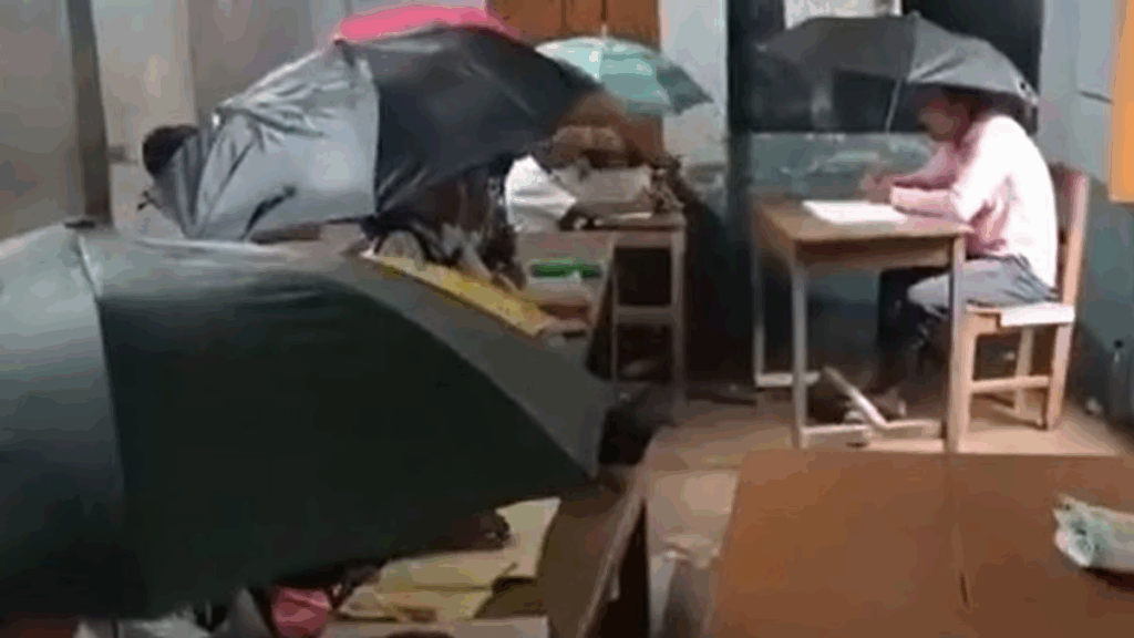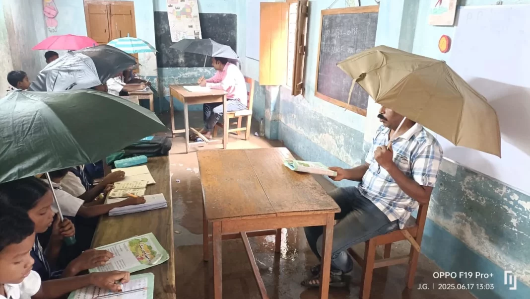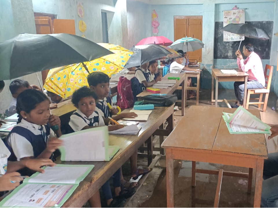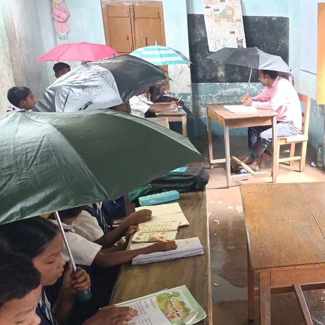 ১৯৭২ সালে প্রতিষ্ঠিত এই স্কুলটির চারটি ক্লাসরুমের মধ্যে অর্ধেকই গত দুই বছরে অবহেলায় ভেঙে পড়েছে। মাত্র তিনটি রুম টিকে আছে, তার অবস্থাও জরাজীর্ণ। এই সপ্তাহের প্রবল বৃষ্টিতে ছাদ ফুটো হয়ে জল পড়তে শুরু করায় শিশুদের ভরসা শুধু নিজেদের সাথে নিয়ে আসা ছাতাগুলো। ছবিতে দেখা গেছে, এক ক্লাসরুমেই প্রায় সত্তরজন ছাত্রছাত্রী, যাদের বয়স পাঁচ থেকে দশের মধ্যে, তারা গুটিয়ে বসেছে ছাতার নিচে। রাজ্যের শিক্ষা ব্যবস্থার এমন দৃশ্য সত্যিই খুব লজ্জাজনক।