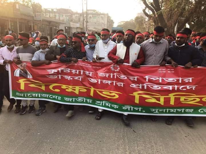 এর প্রতিবাদে রবিবার বিকাল ৪টায় জাতীয় শ্রমিকলীগের অস্থায়ী কার্যলয় হইতে পৌর শহরের গুরুত্বপূর্ণ সড়ক প্রদক্ষিণ করে ট্রাফিক পয়েন্টে এসে প্রতিবাদ সমাবেশ অনুষ্ঠিত হয়। উক্ত প্রতিবাদ সমাবেশে বক্তব্য রাখেন জেলা শ্রমিকলীগের সভাপতি মো. সেলিম আহমেদ, সাধারণ সম্পাদক সাইফুল ইসলাম মুবিন প্রতিবাদ সমাবেশে সেলিম আহমেদ বলেন,“পাকিস্তানের প্রেতাত্মারা ফের সক্রিয় হয়ে উঠেছে। এদের বিরুদ্ধে কঠোর আন্দোলন গড়ে তুলতে হবে। এই গুটিকয়েক উগ্র সাম্প্রদায়িক গোষ্ঠীকে প্রতিহত করতে হবে। যারা জাতির পিতার ভাস্কর্য ভেঙ্গেছে তাদের কোনোভাবেই ছাড় নয়।”এ সময় আরো বক্তব্য রাখেন সহ সভাপতি- আশরাফুল ইসলাম জুয়েল,মজিদ খান সেলিম,মহসিন আহমদ,অসিম রায়,তাপস দাস, যুগ্ন সম্পাদক,গোলাম হাফিজ,রাসেল চৌ,জাহাঙ্গীর আলম ,মো. মনিরুজ্জামান সাংগঠনিক সম্পাদক – দিদারুল বাসার অপু,জাহাঙ্গীর আলম ,রিংকু চৌধুরী,প্রচার সম্পাদক পল্লব রায়,ক্রিয়া সম্পাদক তাপস রায় , সহ প্রচার আমির হোসেন,দপ্তর সম্পাদক শাহিন মিয়া,জাতীয় যুব শ্রমিকলীগ সুনামগঞ্জ জেলার সভাপতি মাহতাব উদ্দিন তালুকদার, সাধারণ সম্পাদক- এ কে মিলন আহমেদ, মোটর শ্রমিকলীগ সভাপতি, হেলিম আহমেদ চৌধুরী সদর উপজেলা যুব শ্রমিকলীগের সভাপতি তৈয়বুর রহমান রাজ প্রমুখ।