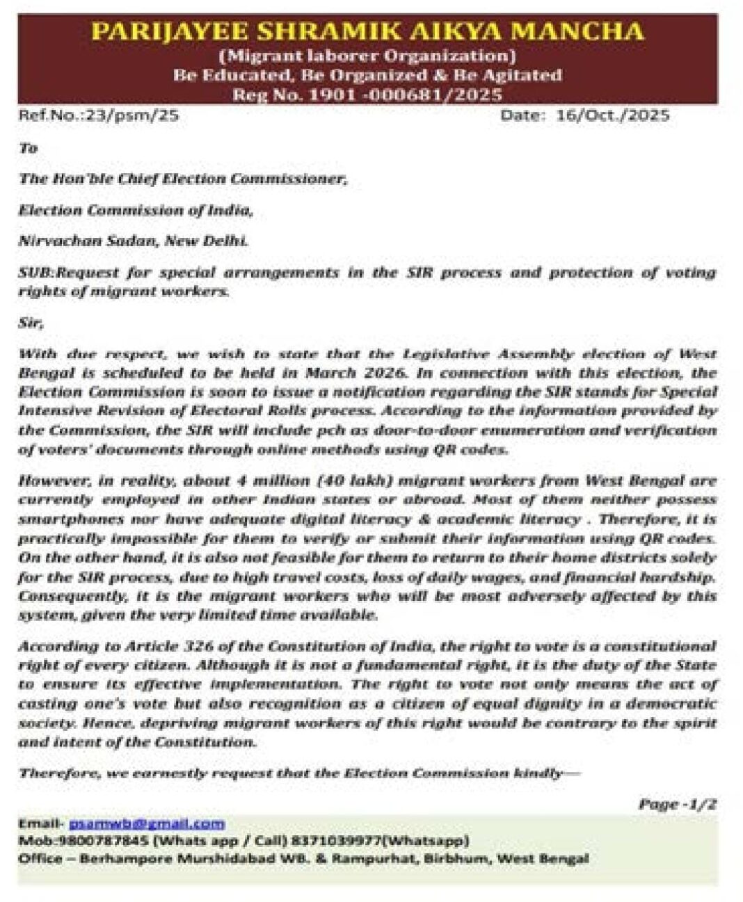 এই সংগঠনের সাধারণ সম্পাদক আসিফ ফারুক জানান, “দেশের বিভিন্ন প্রান্তে বর্তমানে প্রায় ৪০ লক্ষ বাংলা শ্রমিক কাজ করছেন। তাদের ভোটাধিকার যেন নষ্ট না হয়, সেই ব্যবস্থা করা জরুরি।” তিনি আরও বলেন, “শ্রমিকদের জন্য বিকল্প ভোটদানের সুযোগ বা ডাক ভোটের ব্যবস্থাও চালু করা উচিত।” নির্বাচন কমিশনের সাম্প্রতিক নির্দেশিকায় বলা হয়েছে, বাইরে থাকা ভোটাররা অনলাইনে পূর্ণাঙ্গ ফর্ম ও প্রয়োজনীয় নথি জমা দিতে পারবেন। তবে পরিযায়ী শ্রমিকদের জন্য এই সুযোগ কার্যকর হবে কি না, তা স্পষ্ট নয়।
