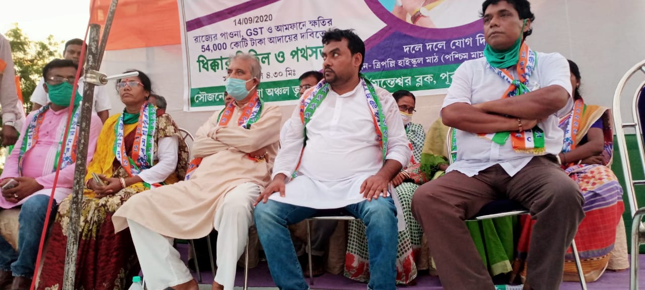 এনবিটিভি ডেস্ক, জ্যোতির্ময় মণ্ডল, পূর্ব বর্ধমান: সোমবার বৈকাল পাঁচটা মন্তেশ্বর ব্লকে শুশুনিয়া অঞ্চলে ভান্ডার পুর ফুটবল মাঠে রাজ্য সরকারের পাওনা ও আমফানের ক্ষতির ৫৪০০০ হাজার কোটি টাকা আদায়ের দাবিতে , শুশুনিয়া অঞ্চল তৃণমুল কংগ্রেসের পক্ষ হইতে তৃণমুল কংগ্রেসের একটি বিরাট জনসভা অনুষ্ঠিত হয়।