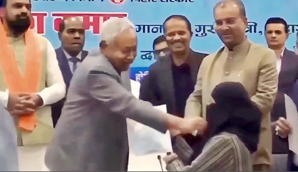 পাটনায় একটি সরকারি অনুষ্ঠানে বিহারের মুখ্যমন্ত্রী নীতীশ কুমারের কার্যকলাপে তোলপাড় গোটা দেশ।গত ১৫ ডিসেম্বর বিহারের মুখ্যমন্ত্রী নীতীশ কুমার আয়ুষ বিভাগে নতুন চিকিৎসকদের নিয়োগপত্র দিচ্ছিলেন। সেই সময় টিব্বি কলেজের স্নাতক তরুণী চিকিৎসক ডা. নুসরাত পারভিন হিজাব পরে মঞ্চে ওঠেন। অভিযোগ, মুখ্যমন্ত্রী তাঁকে কী পরেছেন জানতে চেয়ে প্রকাশ্যে তাঁর হিজাব ধরে টান মারেন। এই ঘটনায় অস্বস্তিতে পড়েন নুসরাত। ঘটনার প্রতিবাদে তিনি বিহার সরকারের চাকরি গ্রহণ করতে অস্বীকার করেন। এই ঘটনার ভিডিও দ্রুত সামাজিক মাধ্যমে ছড়িয়ে পড়ে। শুরু হয় তীব্র সমালোচনা। বিরোধী দলগুলির পাশাপাশি ঝাড়খণ্ডের শাসক দল জেএমএমও ঘটনার নিন্দা করে। এরপর ঝাড়খণ্ডের স্বাস্থ্যমন্ত্রী ইরফান আনসারি ডা. নুসরাতকে চাকরির প্রস্তাব দেন। তিনি মাসিক তিন লক্ষ টাকা বেতনের প্রস্তাব দেন বলে জানা গেছে। যদিও ঝাড়খণ্ড সরকারের পক্ষ থেকে এখনও আনুষ্ঠানিকভাবে চাকরির বিষয়ে চূড়ান্ত সিদ্ধান্ত জানানো হয়নি। ঘটনাটি নিয়ে রাজনৈতিক মহলে বিতর্ক এখনও তুঙ্গে।